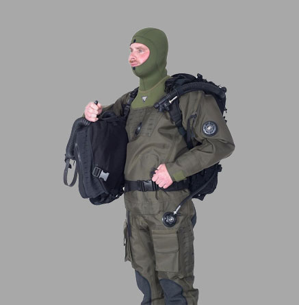 The suit is made from trilaminate material as face nylon „rip-stop” in olive color or black color / butyl rubber in the mid / polyester as bottom layer which is flexible and provides good maneuverability.