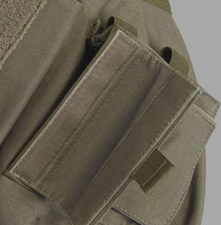 two cargo pockets placed on the side of legs installed in molle system of straps made in lasered version, where flaps of cargo pockets at the bottom part have inside a special elastic ropes enabling better catching by hands dressed in gloves,