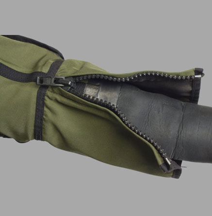 The suit has “relief” plastic gastight YKK zipper in front of torso covered by protective flap with zipper of YKK.