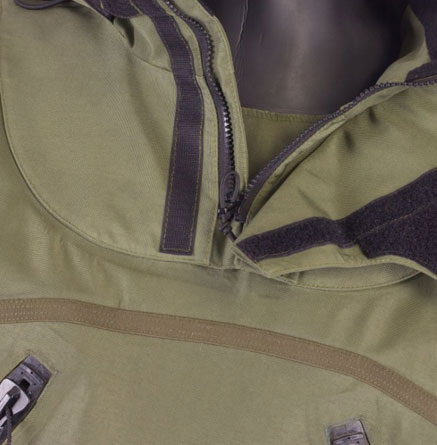The suit is made from breathable, waterproof polyamide fabric in green NATO color.