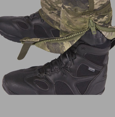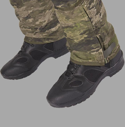 Suit has two cargo pockets placed on the side of legs installed in molle system of straps made in lasered version, where flaps at the bottom parts have inside a special elastic ropes enabling better catching by hands dressed in gloves: