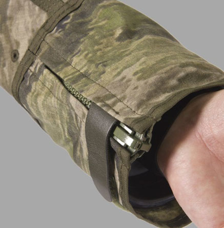 External cuffs at wrists and ankles area have short plastic YKK zippers and additionally have also a solution of rubber strap-Velcro fasteners for keeping slider locks of YKK zippers in fixed position what eliminates the risk of hooking up while moving hands/legs.