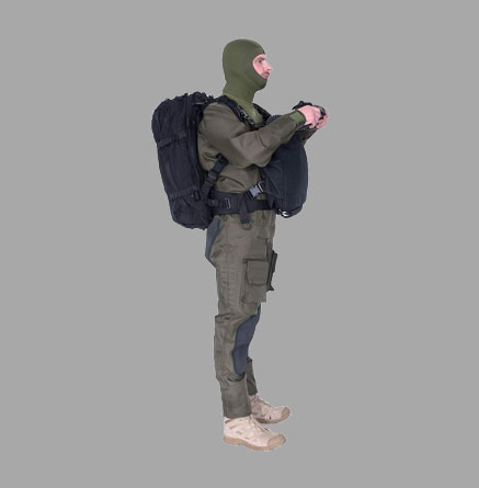 왼쪽 다리에는 두개의 Molle 플랫폼이 있어 탈부착식 수납용 포켓과, 0.5L 용량의 실린더 포켓을 각각 설치할 수 있음. Sitech 배기 밸브는 탈부착식 수납용 포켓 위에 위치함