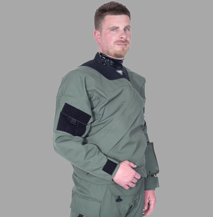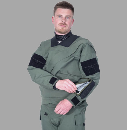 플라스틱 기밀 TIZIP 지퍼가 상체 앞부분에 대각선으로 위치하며, 착용자가 쉽게 닫고 열 수 있도록 셀프 클로징 덮개로 보호됨