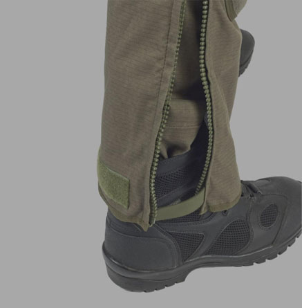 손목과 발목 부분의 외부 커프는 짧은 플라스틱 YKK 지퍼가 있으며, 슬라이더 잠금 장치를 고정하는 고무 벨크로 스트랩이 있어 움직임 중 걸림을 방지함