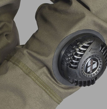 Apeks 배기 밸브는 왼쪽 소매의 전완부에, 흡입 밸브는 왼쪽 다리 앞부분에 위치함