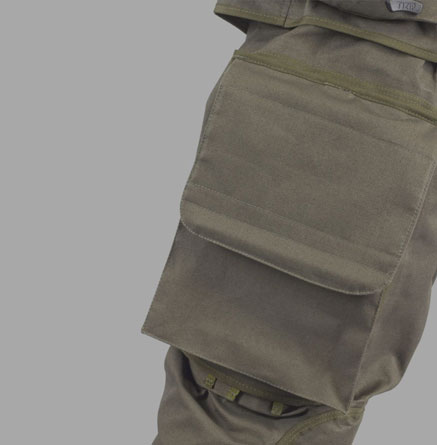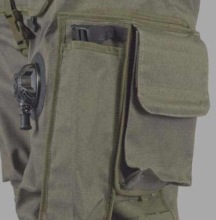 레이저 처리된 Molle 시스템 스트랩에 설치된 다리 측면에 위치한 두개의 수납용 포켓, 포켓하단에는 손에 장갑을 착용한 상태에서 쉽게 잡을 수 있도록 내부에 탄성 로프가 포함됨