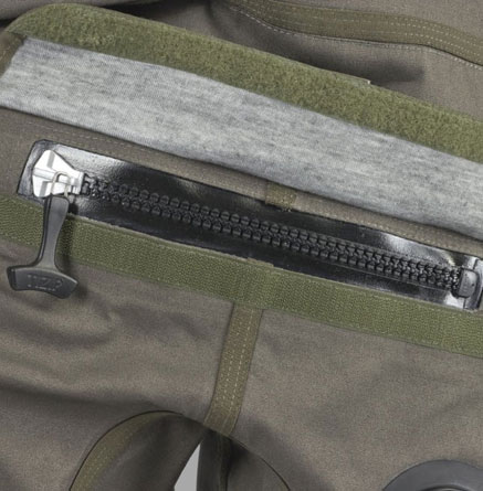 플라스틱 기밀 TIZIP 지퍼가 상체 앞부분에 대각선으로 위치해 착용자가 쉽게 열고 닫을 수 있으며, 벨크로가 있는 덮개로 보호됨