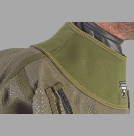 강력하게 접착 처리된 HD 라텍스 목 씰은 외부 네오프렌 보온 칼라로 보호됨