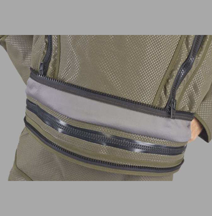 플라스틱 기밀 TIZIP 지퍼가 상체 앞부분에 수평으로 위치해 착용자가 쉽게 열고 닫을 수 있으며, YKK 플라스틱 지퍼가 있는 덮개로 보호됨