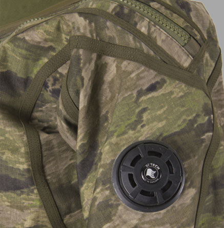 슈트 다리 측면에 레이저 처리된 Molle 시스템 스트랩으로 설치된 두개의 수납용 포켓이 있으며, 포켓 하단부에는 장갑을 착용한 손으로 쉽게 잡을 수 있도록 내부에 특수 탄성 로프가 있음