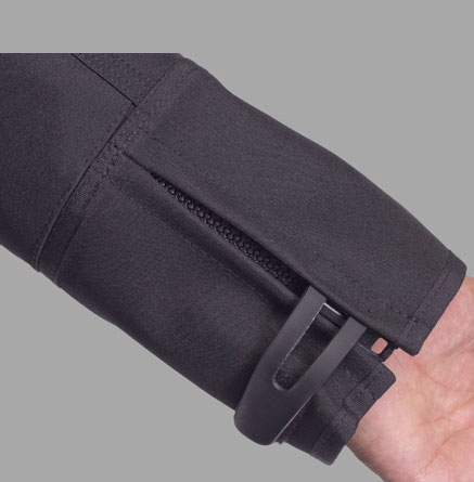 손목 부분의 외부 커프는 짧은 플라스틱 YKK 지퍼가 있으며, 슬라이더 잠금 장치를 고정하는 고무 벨크로 스트랩이 있어 움직임 중 걸림을 방지함