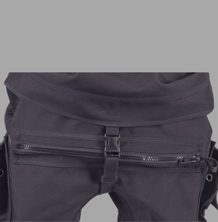 비자성 금속 기밀 Dynat/YKK 지퍼가 앞부분에 위치하며, 플라스틱 YKK 지퍼가 있는 보호 덮개로 보호됨