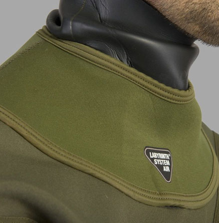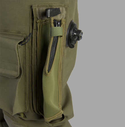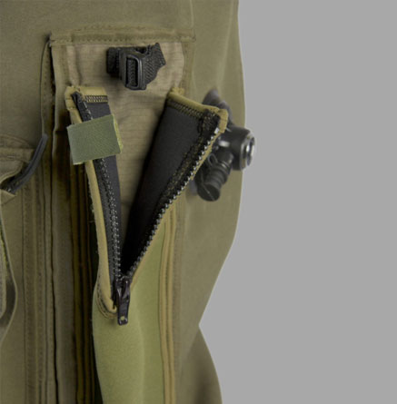 YKK 플라스틱 기밀 지퍼가 상체 전면에 대각선으로 배치되어 있으며, 초록색 YKK 플라스틱 지퍼가 달린 덮개로 보호됨
