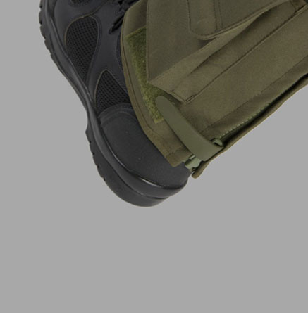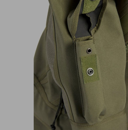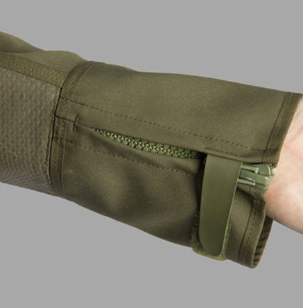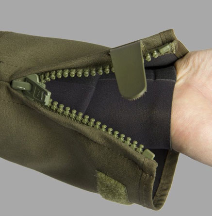 손목과 발목 부분의 외부 커프는 짧은 플라스틱 YKK 지퍼가 있으며, 슬라이더 잠금 장치를 고정하는 고무 벨크로 스트랩이 있어 움직임 중 걸림을 방지함