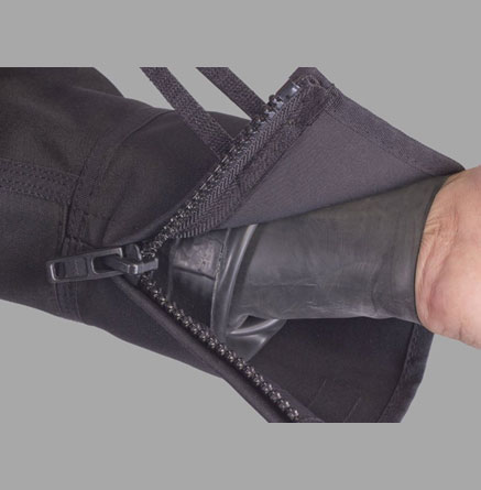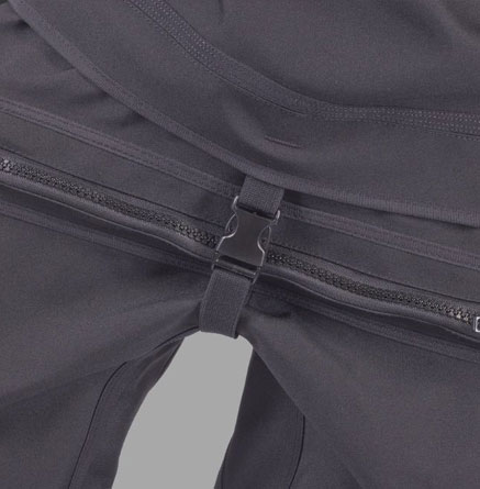 금속 기밀 지퍼 Dynat/YKK 가 상체 앞부분에 대각선으로 위치해 착용자가 쉽게 열고 닫을 수 있으며, 플라스틱 YKK 지퍼가 있는 덮개로 보호됨